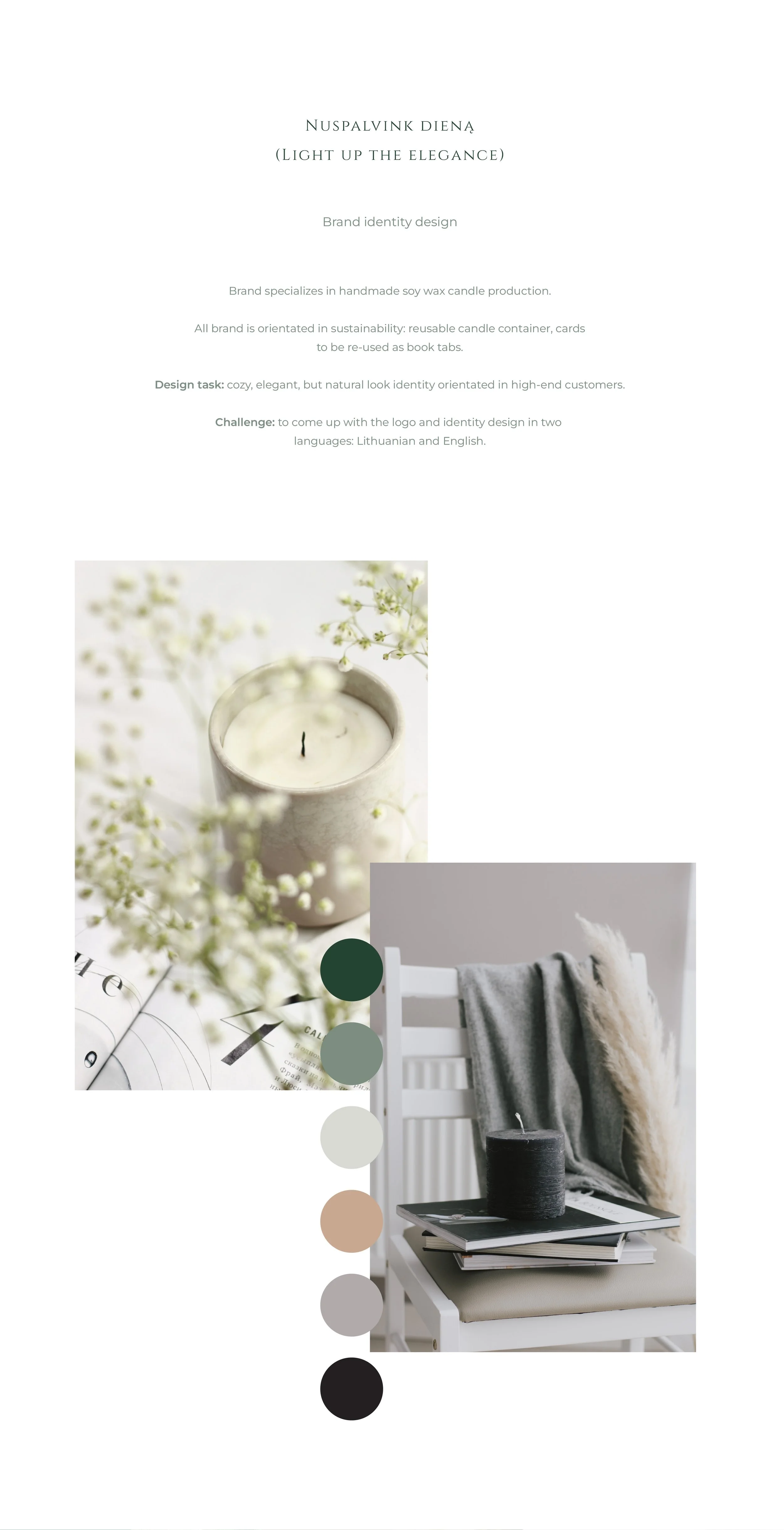 Nuspalvink dieną (Light up the elegance) – tai Giedrės kuriamos rankų darbo sojų vaško žvakės. Kodėl sojų vaškas? Nes jis yra sveikas, ekologiškas deginimui, neturi kenksmingų medžiagų kaip parafinas.